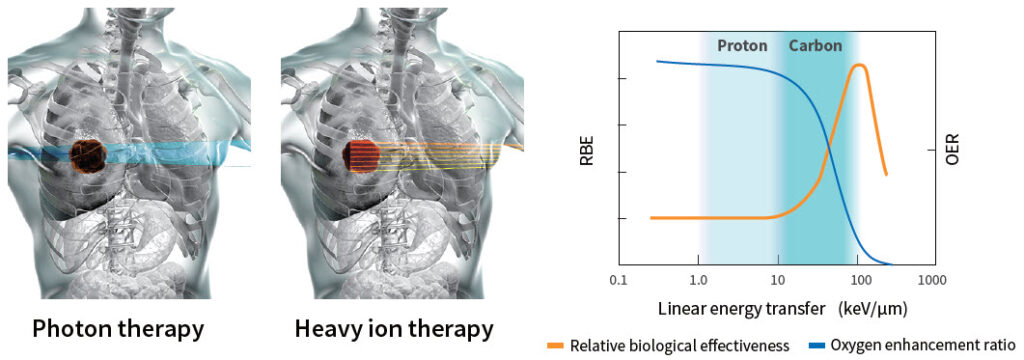 Heavy ion therapy provides excellent dose distribution for tumor volume compared to photon and proton therapy, because of the physical properties of the charged particles; meaning the sharp Bragg peak and small scattering angle, which reduce side effects for normal tissue and adjacent organs. The relative effectiveness of photon and proton therapy compared to Toshiba’s Heavy Ion therapy is minimal. Further, the linear energy transfer (LET) for heavy ion beams is known to exhibit large relative biological effectiveness (RBE) at the tumor position. These properties realize precision radiotherapy that is unique and unparalleled to the conventional radiotherapy.